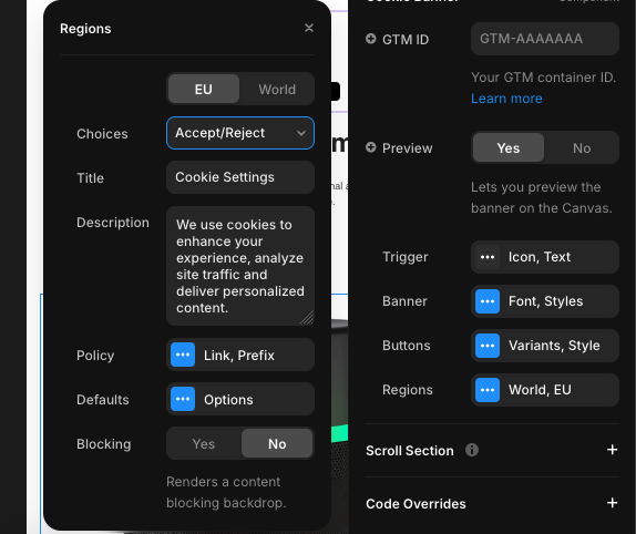 For the PixelFlow script to run, the user needs to grant "Marketing" permissions. The Framer component will track if a user has given these permissions and send them to GTM where its "Consent Mode" will check if permission is given and then run the script