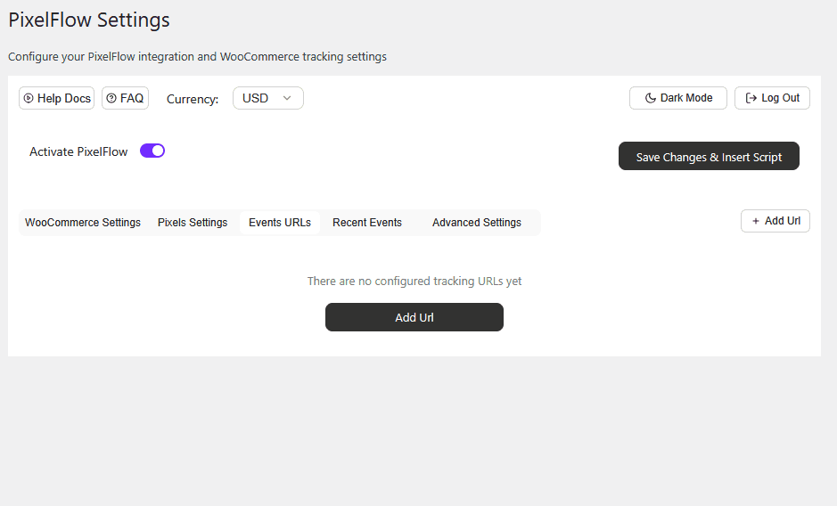 In your Wordpress website, go to Settings, PixelFlow Settings and click on the "Event URLs" tab