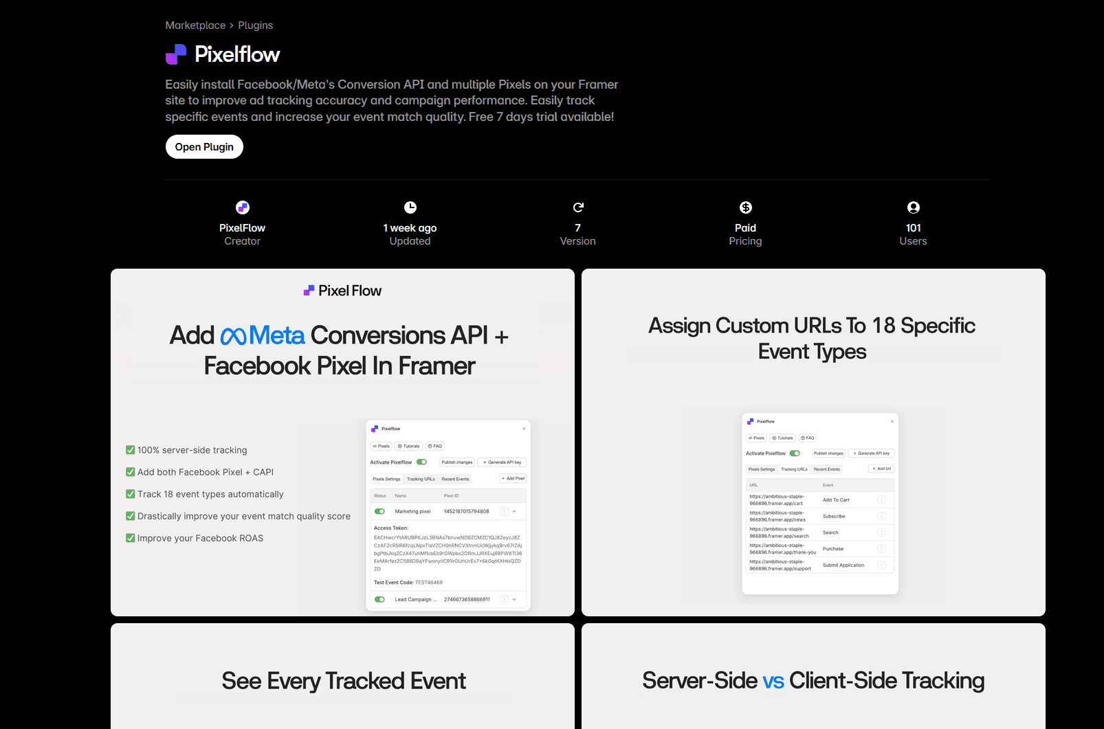 This article guides you through setting up the Facebook Conversions API on Framer using the official PixelFlow plugin from the Framer Marketplace. This is the recommended method for automatic setup and management.