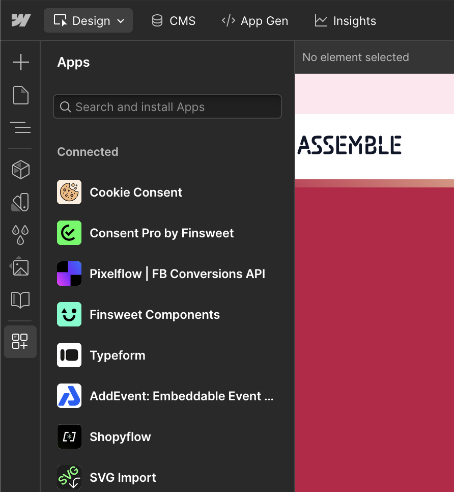Where to find Design Mode: Design Mode is located in the top-left corner of the Webflow editor. Make sure it's selected (not "Preview" or other modes) before accessing the Apps menu.