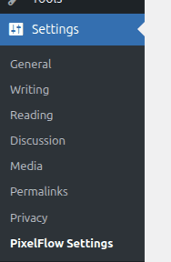 You can also open this page by visiting this path for your website: /wp-admin/options-general.php?page=pixelflow-settings