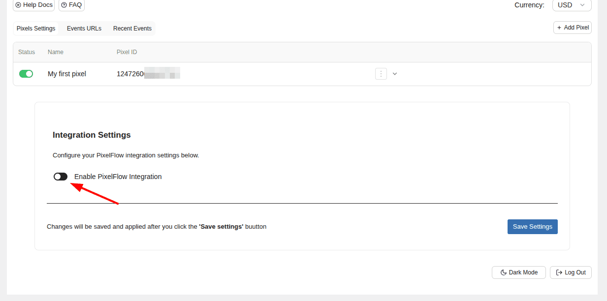 Toggle ON the ‘Enable PixelFlow Integration’ switcher