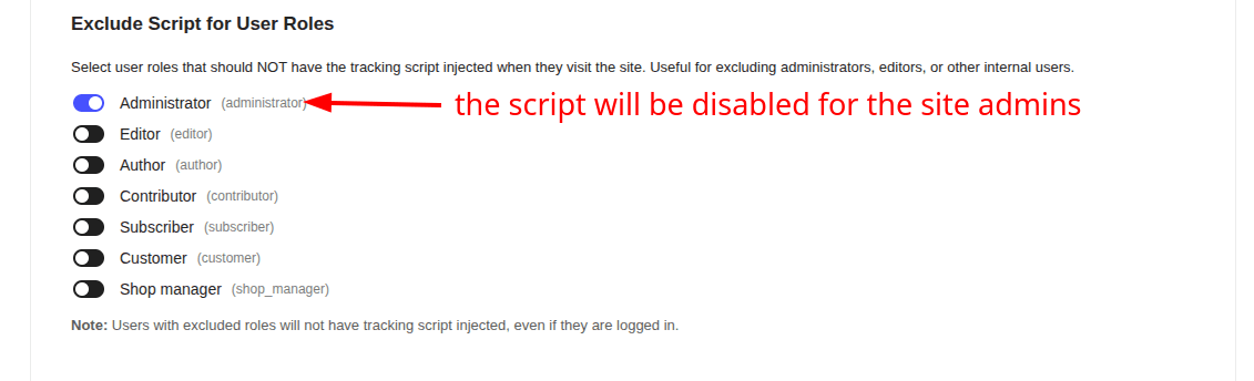 You may not want to track the events for yourself and the editors. So you can exclude those roles from tracking (by default any site user actions will be tracked)