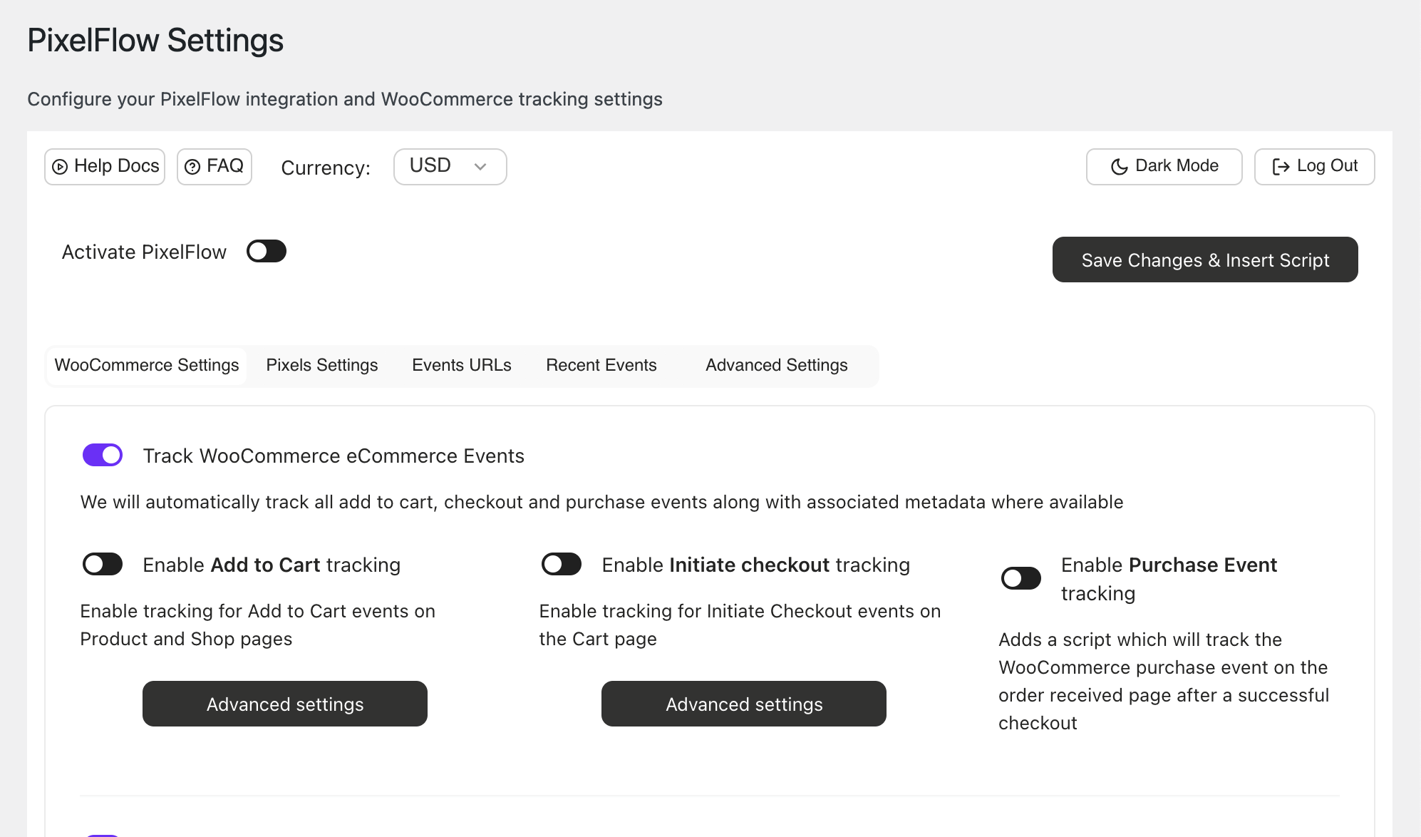 WooCommerce Auto-Tracking: Automatically track product views, add to cart, checkout, and purchases (see Advanced Configuration below)