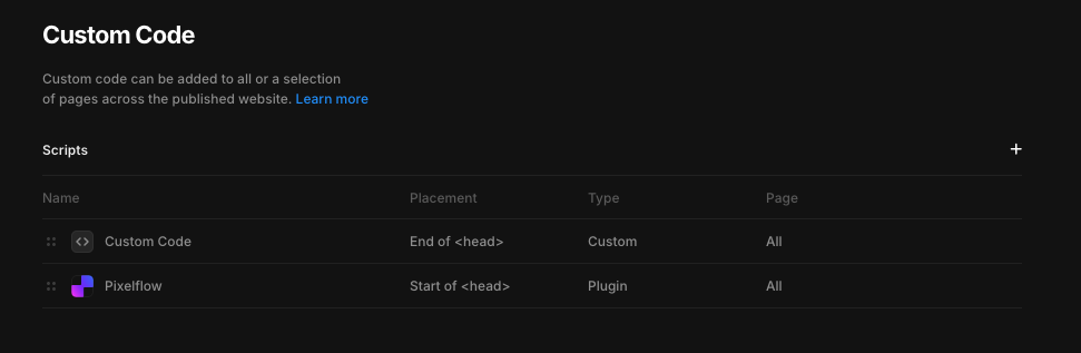 <script src="https://cdn.pixelflow.so/script.js?pixel=YOUR_PIXEL_ID"></script> 4. Skript zum benutzerdefinierten Code in Framer hinzufügen