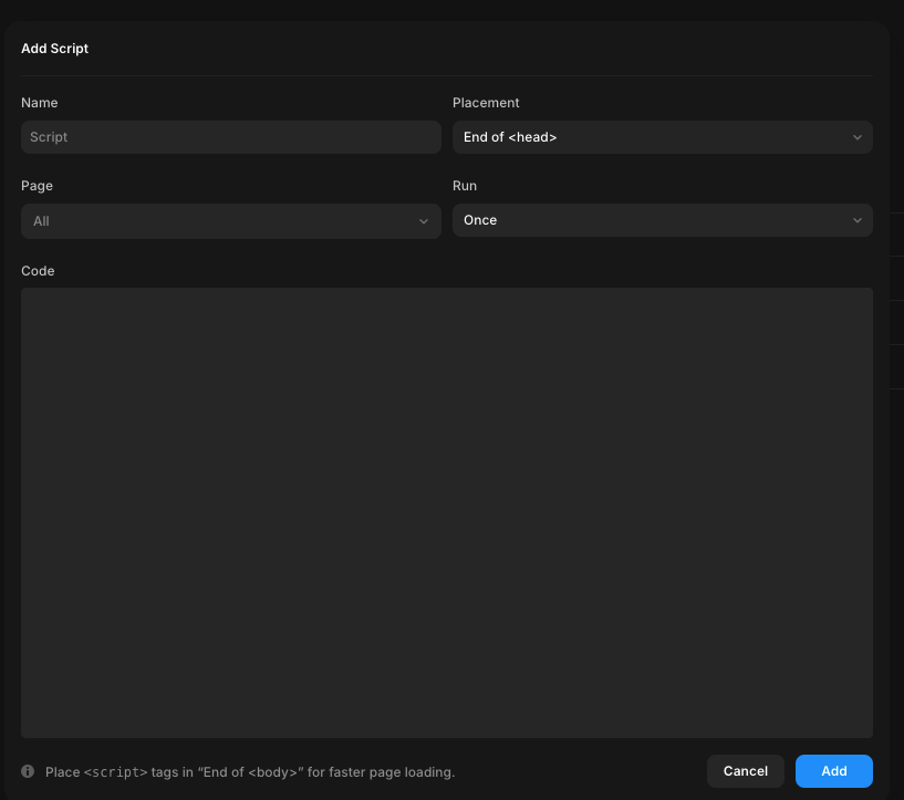 Nun fügen Sie das PixelFlow-Skript zum Bereich für benutzerdefinierten Code Ihrer Framer-Website hinzu: