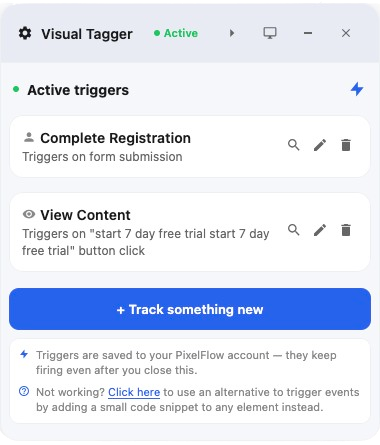 El etiquetado manual es más artesanal, pero te da un control más sólido sobre cómo se activan los eventos y qué datos captura PixelFlow. Es el mejor método a usar si el Visual Tagger no puede capturar los datos.