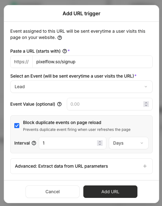 Activadores por URL: Ideales para páginas de agradecimiento, confirmaciones de reserva y otros hitos de carga de página.
