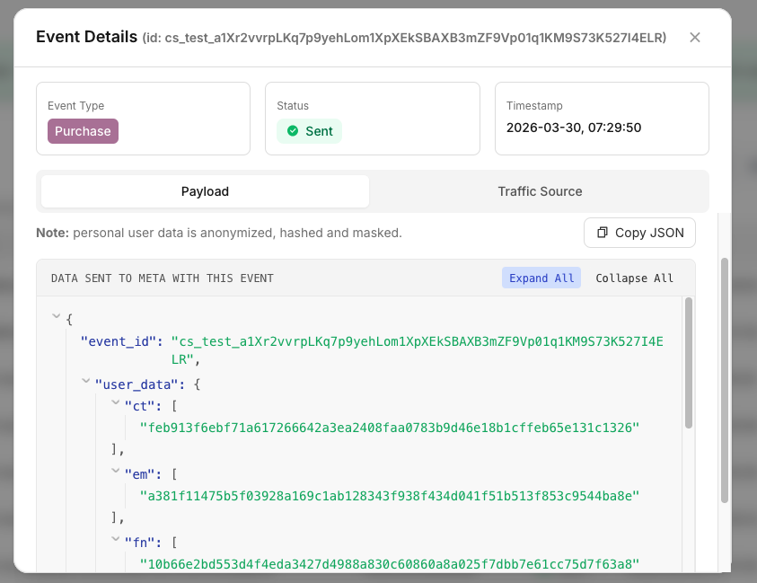 Personal user data in the advanced payload is anonymized, hashed, and masked in the dashboard.