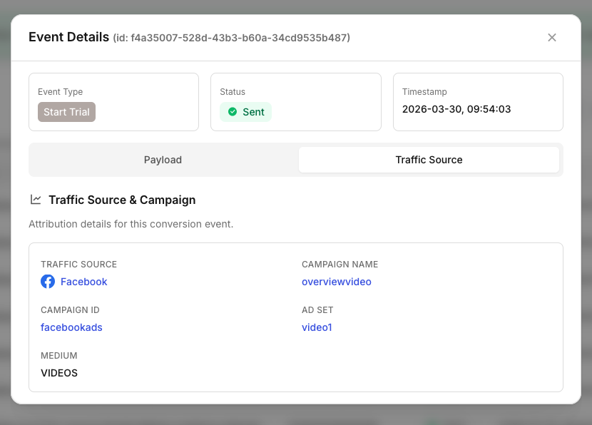 Depending on the event, you may see fields such as Traffic Source, Campaign Name, Campaign ID, Ad Set, Ad Name, and Medium.
