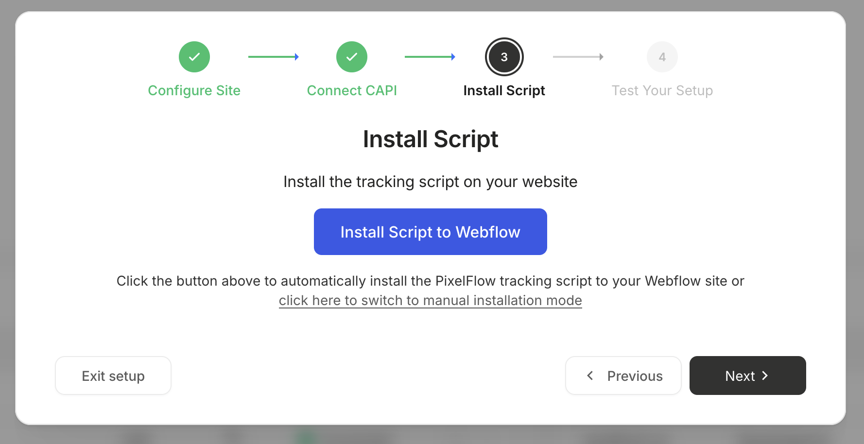 Click on Install Script to Webflow to automatically add the PixelFlow script on your website and press Next